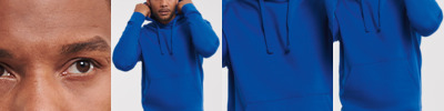 80% combed ringspun cotton/20% polyester. Cotton faced fabric. Brushed back fleece. Drop shoulder style. Double fabric hood with topstitch detail. Flat lace drawcord with buttonhole eyelets. Taped neck. Front pouch pocket with bartacks. Ear phone access. 1x1 ribbed cuffs and hem. Coverseamed around hood, shoulders, armholes, cuffs and hem.